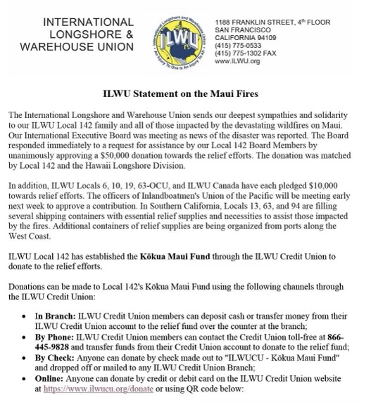 Aloha, Local 1000 Executive Board and Members! Just FYI, International ILWU V.P.-Hawaii, Sam Kreutz, has spent the last several days assisting cargo distribution and hotel accommodations for relief efforts on Maui. He wants to express his thanks to those who are contributing to relief efforts. There are thousands of ILWU members and families in the Lahaina area, as well as Kaanapali, Kapalua, Kihei, and Upcountry Maui. V.P. Kreutz is himself a resident of Maui so he feels great appreciation for all the support for his home island. Mahalo! Sam Kreutz ILWU Vice-President (Hawaii) gives his thanks to those who donated to support disaster relief in Maui (2023) To make a financial donation you can do so at the ILWU Credit Union website: https://www.blogger.com/u/0/blog/post/edit/4408710173500091999/1758028777632711404